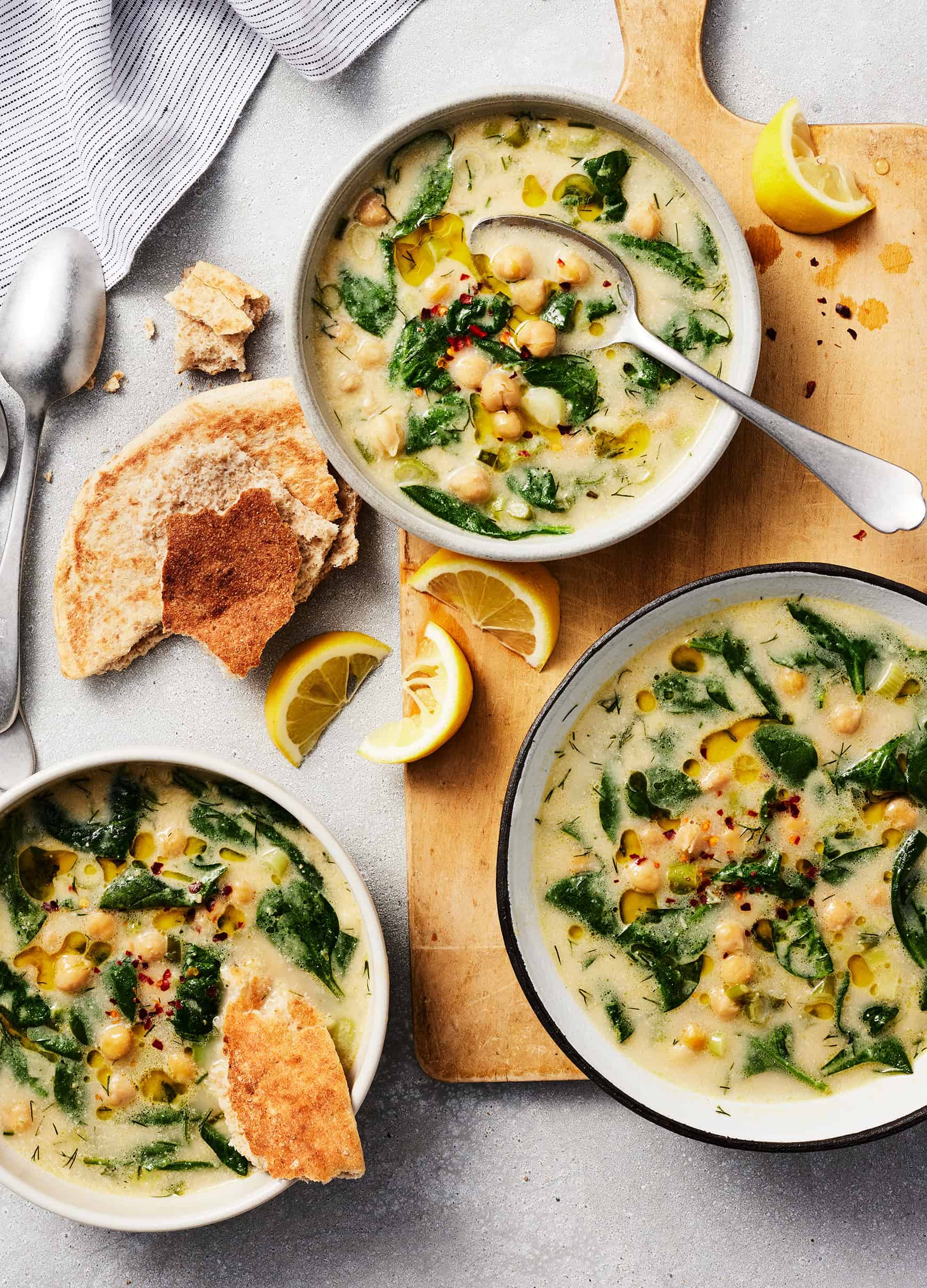 This chickpea soup recipe is my idea of the perfect weeknight dinner. Canned chickpeas, the starting point of so many of my favorite dinners, are the star ingredient here. Some stay whole for texture, while the rest blend with tahini to make the soup lightly creamy. Spinach, dill, and a squeeze of lemon juice brighten the whole thing up. This chickpea soup comes together in 30 minutes, calls for basic pantry ingredients, and is still somehow comforting, satisfying, and fresh. I first shared it in Simple Feel Good Food, and it’s since become one of the most-made recipes in the book—by me…